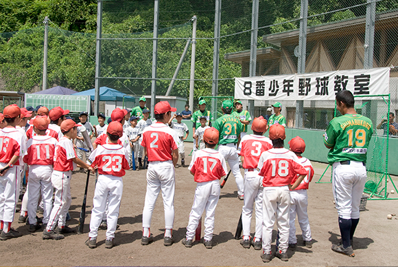 子供たちの健やかな成長を願い、富山、石川、福井のプロ野球独立リーグ(BCリーグ)の各球団の監督、選手の協力のもと、毎年夏に「8番少年野球教室」を開催していました(全20回)。学童野球チームに所属する児童に、守備の基本姿勢や走塁のコツ、キャッチボールのフォームなどを指導していました。