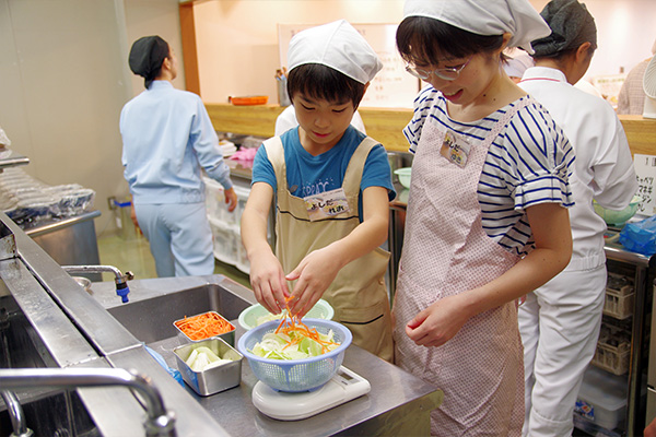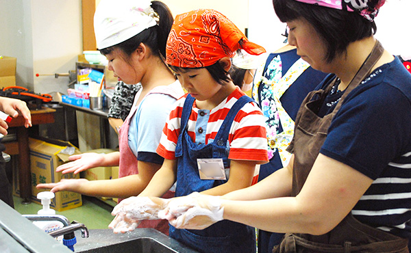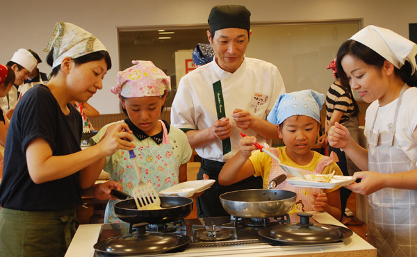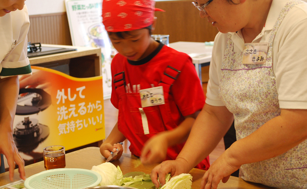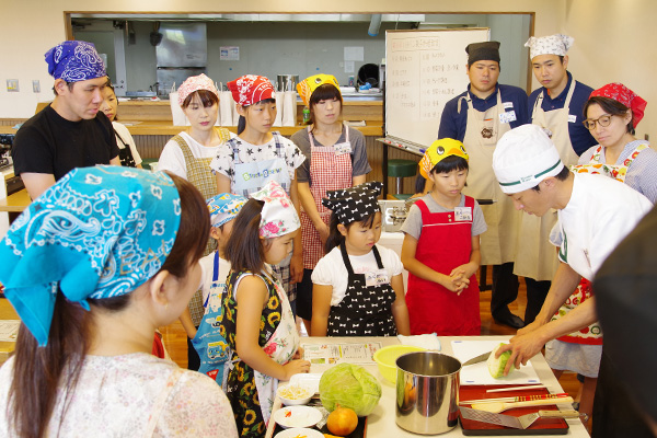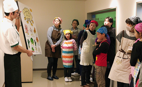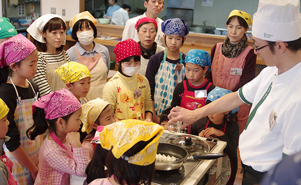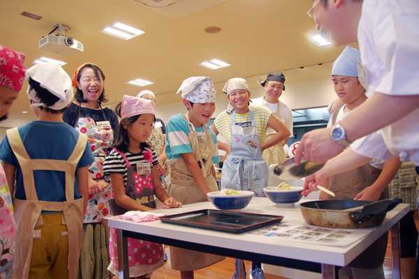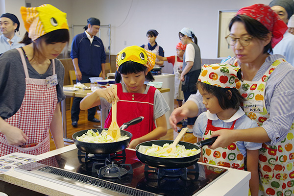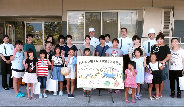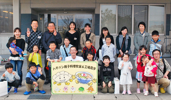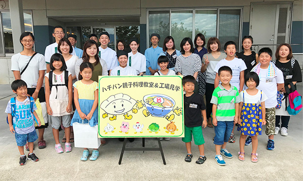 当社は、食育の一環として、「食」への関心を深めていただくことを目的に、毎年春休みと夏休みに、株式会社エネアーク中部様と共同で「ハチバン親子料理教室&工場見学」を開催しています。