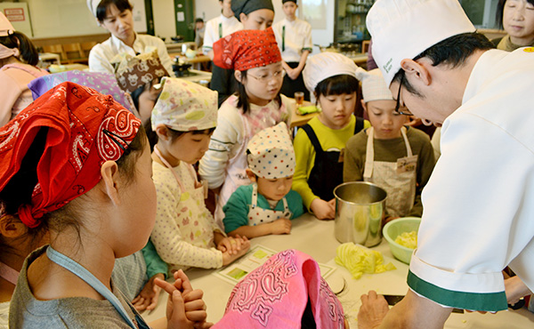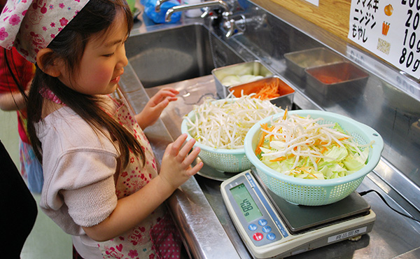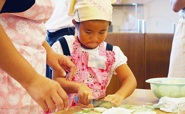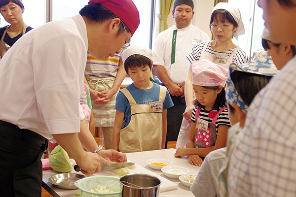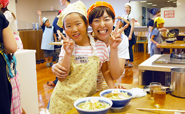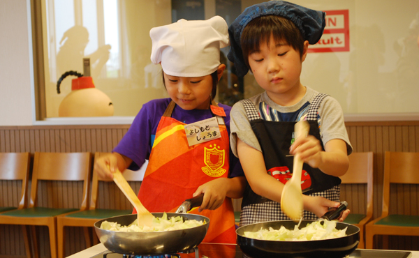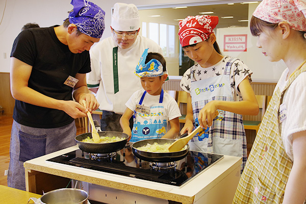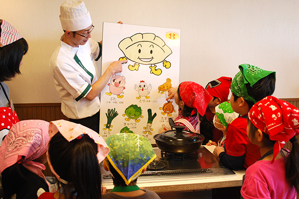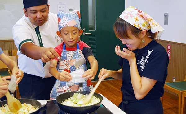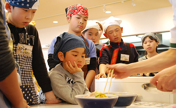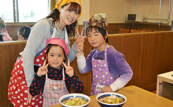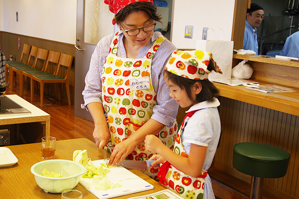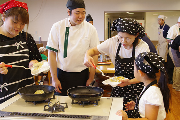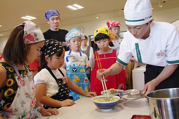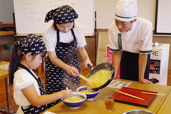 調理は、「らーめんマイスター」の称号を持つ当社社員が先生となって丁寧に教えます。野菜の切り方からラーメンを美味しく作る手順やコツ、失敗しない餃子の美味しい焼き方を知ってもらい、保護者の方々にも好評を得ています。