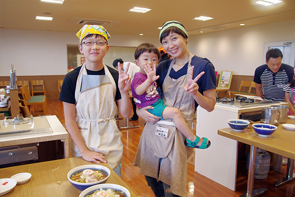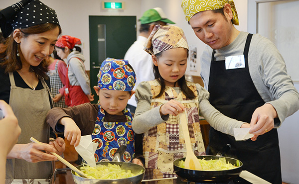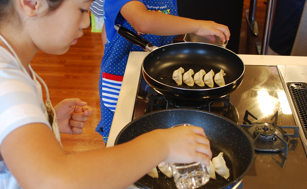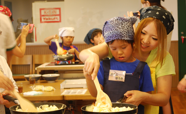 親子で、野菜を切るところからラーメンを作り、家庭用フライパンで8番餃子を焼きます。カラダに良い食材を使って、おいしいラーメンを「自分で作る」ことを、親子で体験していただいています。