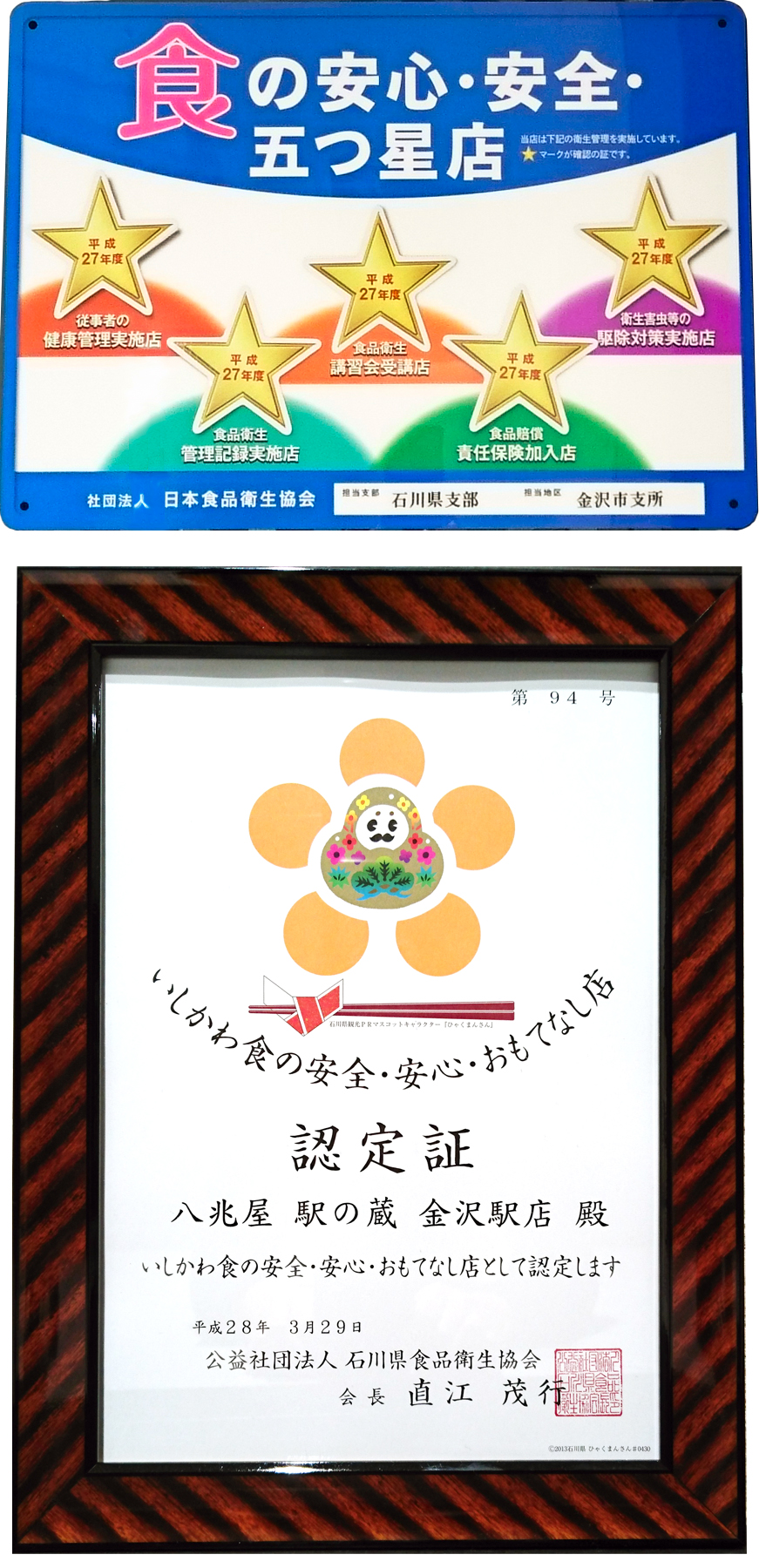 当社が運営する以下の店舗は、石川県食品衛生協会が認定する「いしかわ食の安全・安心・おもてなし店」に外食チェーンで初めて認証を受けました(2016年3月29日)。