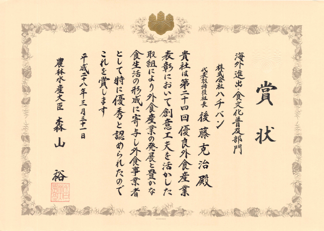 当社は、農林水産省が行う優良外食産業表彰において、「海外進出・食文化普及部門」大臣賞を受賞いたしました。(2016年3月31日)