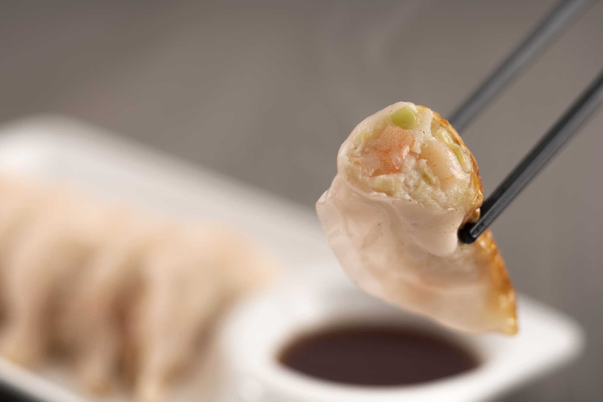 具は、海老の旨味・食感を活かす為に、野菜や鶏肉・生姜をバランスよく配合しました。皮もエビの食感を生かすため、もっちりした食感で、天然着色でほんのりピンク色に仕上げています。“透明感”のある皮が「見た目の美味しさ」を引き立てています。にんにくを使っていないので、時間を気にせず食べることができ女性にもおすすめです。あっさりとした飽きのこない味で、何個でも食べたくなるよう仕上げております。
