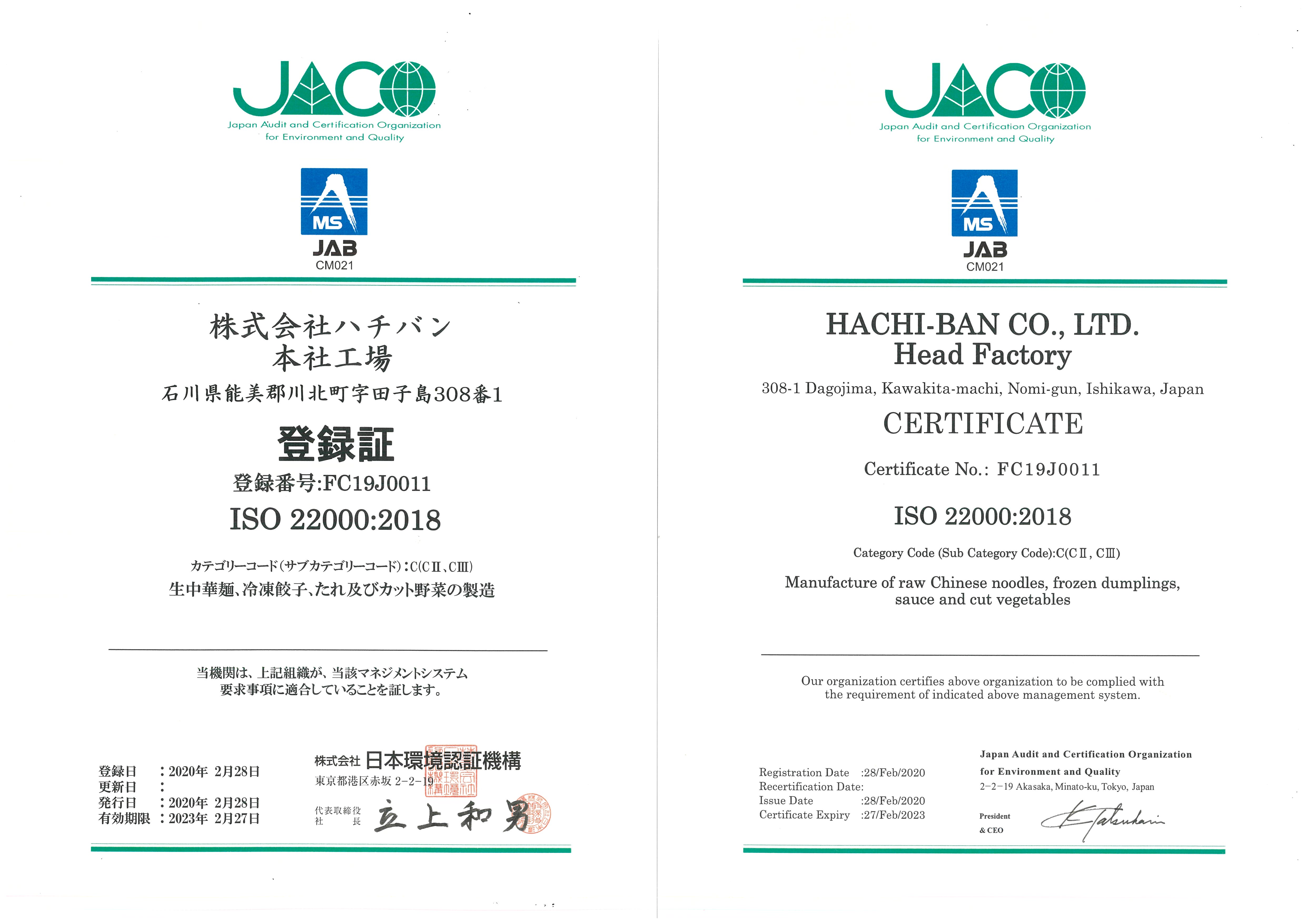 当社はこのような中、2020年2月28日付で、食品製造拠点である本社工場において食品安全の国際規格である「ISO22000:2018」を認証取得いたしました。