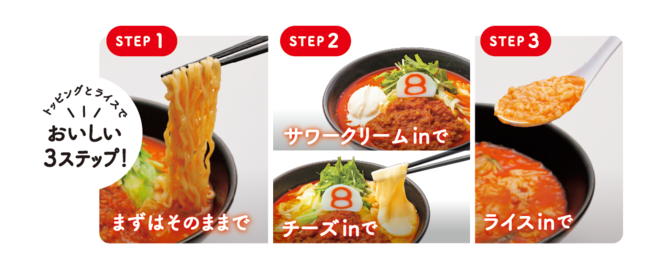 野菜トマトらーめんは、トッピングとリゾット用のライスで「おいしい3ステップ」をお楽しみいただけます。今年は、サワークリームとチーズ、2種類のトッピングで、さらに楽しみ方が広がるラインナップ。食べ終わったスープで作るトマトリゾットは、まさに絶品です。