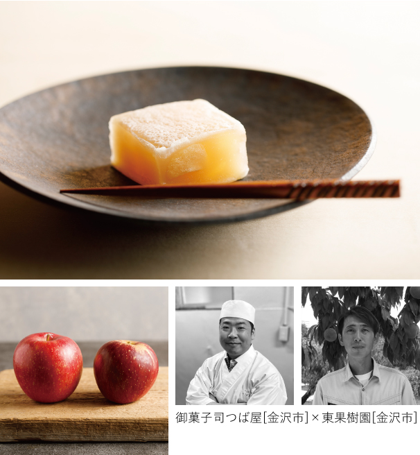 東果樹園(金沢市湯涌)の林檎「陽光」「秋星」2種類を使用し、御菓子司つば屋(金沢市松村)がきんつばに仕上げました。それぞれの糖度や酸味、熱を加えた時の溶けやすさなど、林檎の特徴を農家と菓子職人が一緒に相談しながら作った、林檎の食感が残る爽やかな味です。