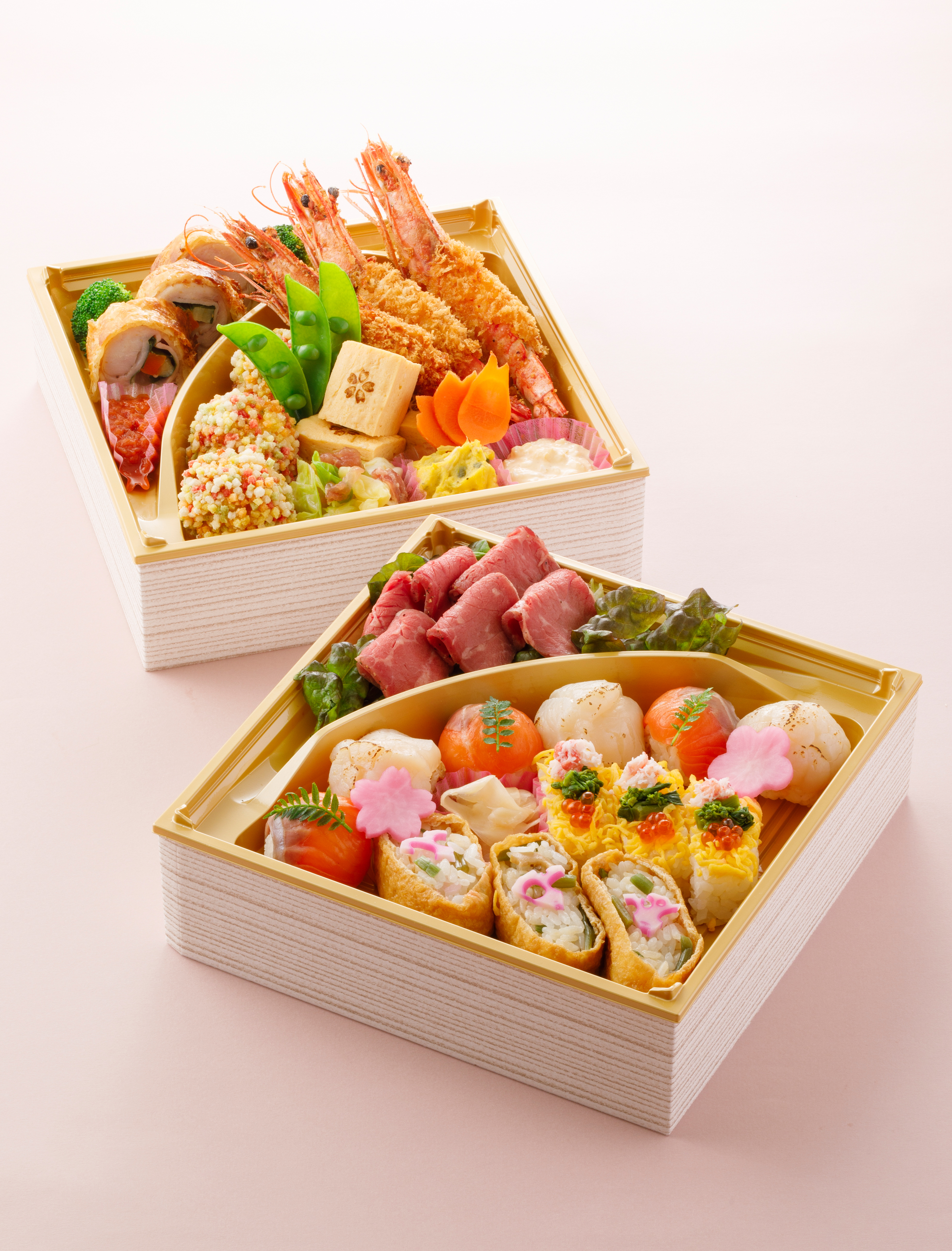 | 商品内容 | 【一の重】 ・サーモンと炙り帆立の手毬寿し ・かにといくらの春色押し寿し ・山菜筍いなり寿し ・ローストビーフサラダ 【二の重】 ・チキンロールのパイ包み焼き ・真鯛真丈の5色あられ揚げ ・有頭海老フライ ・筍入りハンバーグ ・玉子焼き ・南瓜のポテトサラダ ・春キャベツと生ハムのマリネ |