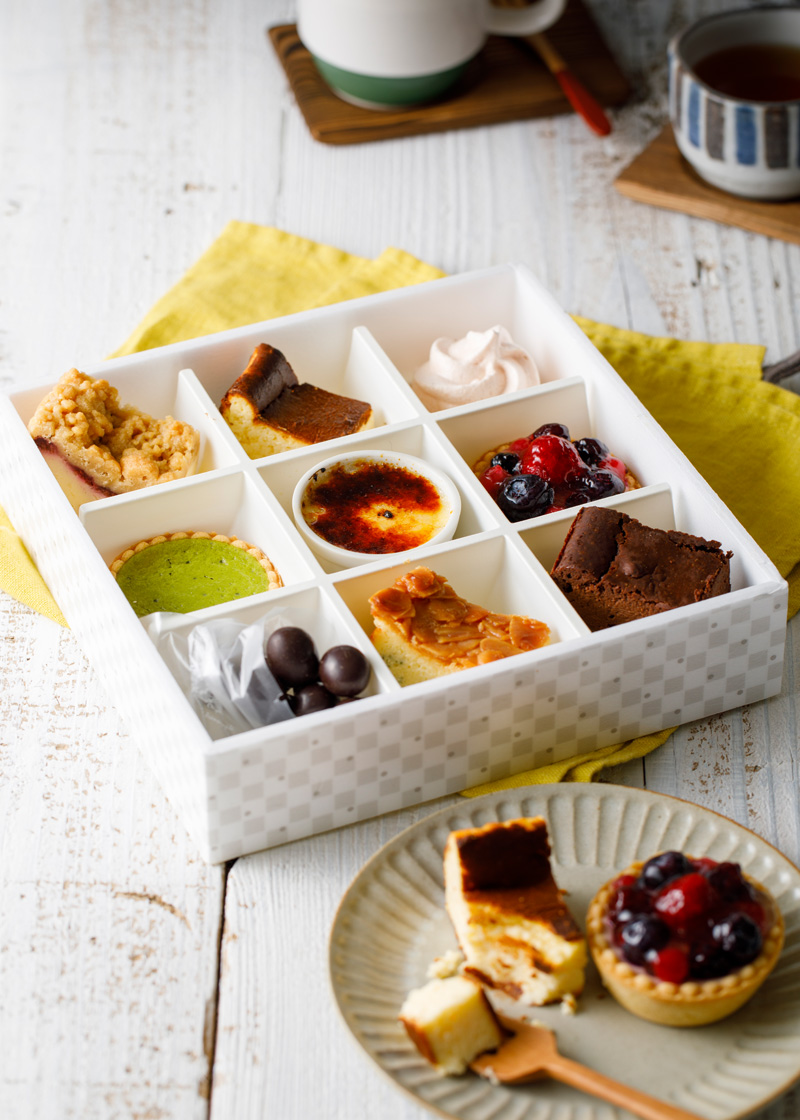 テイクアウト限定のお茶菓子BOX。ご家族・ご友人との団らんやおもてなしに、お家でカフェ気分が味わえる八兆屋の人気スイーツをお楽しみください。