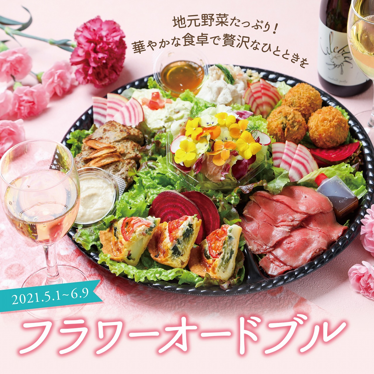 真ん中には、地元栽培のエディブルフラワーで花束をイメージしたサラダを。周りの料理は、風土ぴあの人気デリと、季節の新作メニューで彩り豊かに。日頃の感謝をこめて、「母の日」の贈り物としてもおすすめです。