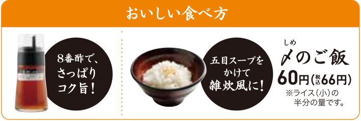 穀物酢に大麦黒酢をブレンドした8番オリジナルの「8番酢」を足すことで、さっぱりコク旨に!味変も、ぜひお楽しみください。