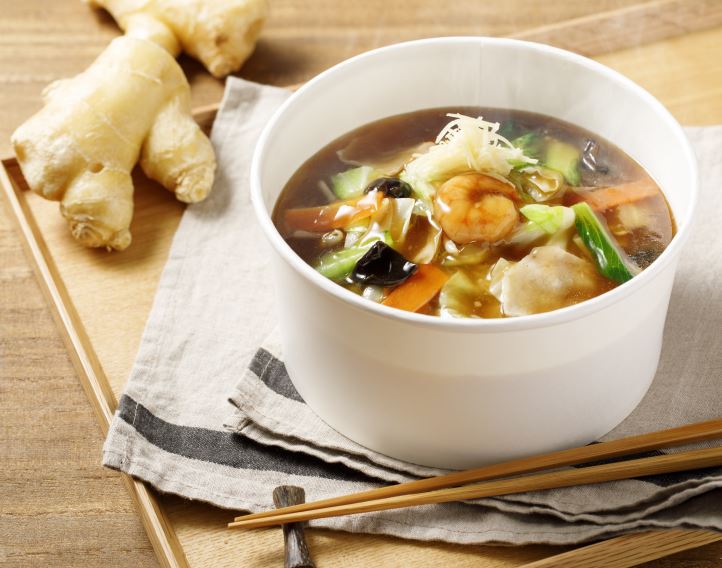 テイクアウトのらーめんメニューは全て2層式容器です。麺はのびにくく、スープはアツアツのまま。お召し上がりの際に、麺と具をスープに入れてお召し上がりください。