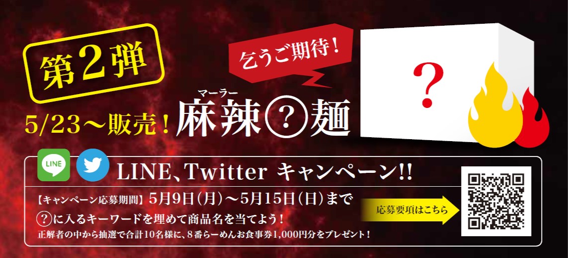 5月9日からは、第二弾として発売される「麻辣○麺」のメニュー名を当てるキャンペーンを実施。抽選で合計10名様に「8番らーめんお食事券1,000円分」が当たります。みなさまのご応募をお待ちしております。