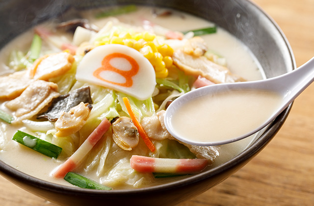 8番流「ちゃんぽんらーめん」は、生姜の香りとあさりの旨み、11種類の具材を使用した具だくさんのらーめんです。今年は辛みそで味変ができる「辛旨ちゃんぽんらーめん」も新登場です。