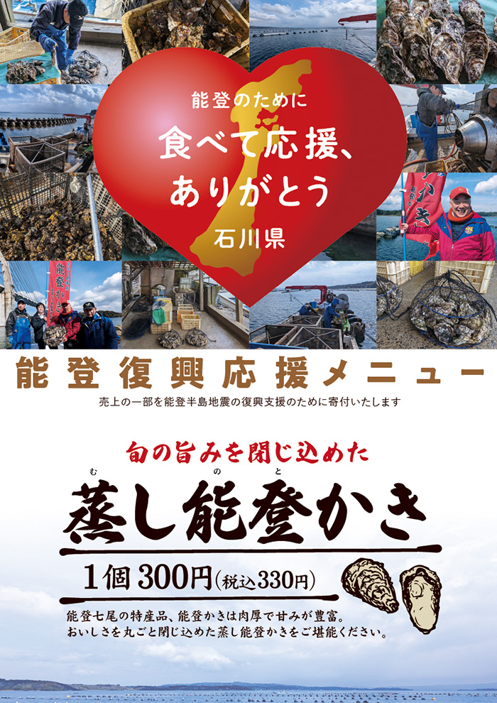 今回、「蒸し能登かき」の売り上げの一部を能登半島地震の復興支援のために寄付します。