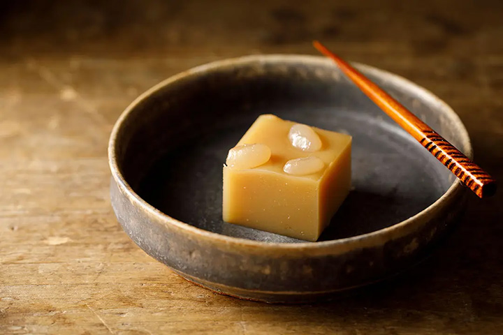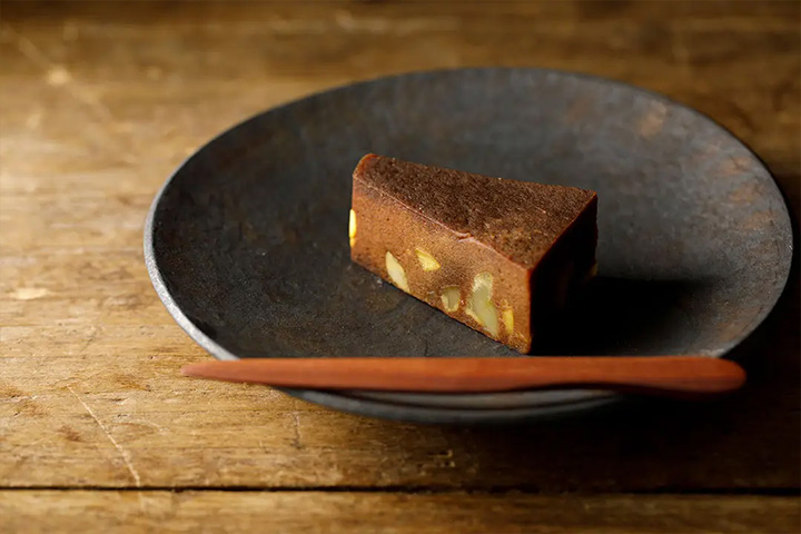 玄米と米麹だけで作った口当たりの良い金沢大地の「とろとろ玄米甘酒」を羊羹にして、能登塩を効かせた『塩羊羹』です。上に手亡豆の鹿の子豆を乗せました。キャラメルのような香ばしさを感じ、甘さと塩加減が良い塩梅です。