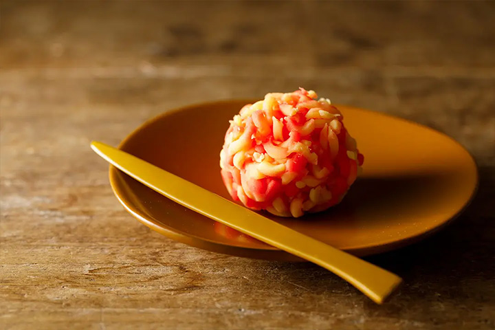 国産有機米と国産有機大豆を天然蔵で長期間熟成させた十二割糀の味噌で、米麹を大豆より多く使い、濃厚で米の甘さが際立つ「米麹味噌」を餡に使用、こっくりとした深みのある餡になりました。能登の山々の紅葉を表現しています。